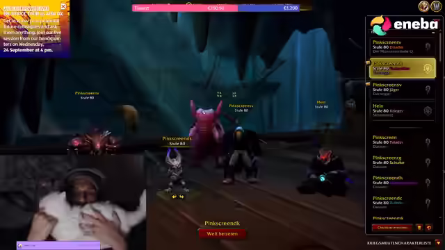 pink_screen hat erfolgreich DIMENSIUS HC & RESI Keys (12-16) in World of Warcraft abgeschlossen. Im Verlauf gab es Diskussionen über Ausrüstung, Musikwünsche und die Zusammenstellung von Dungeon-Gruppen. Strategien für Bosskämpfe wurden analysiert und optimiert, inklusive der Nutzung von Makros und der Anpassung an verschiedene Spielsituationen. Abschließend wurden Taktiken für den Raid besprochen und die Lootverteilung erklärt.