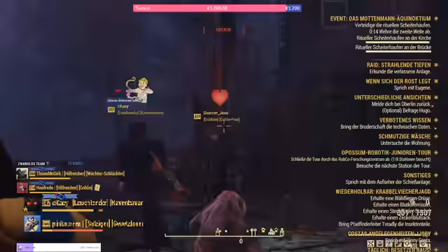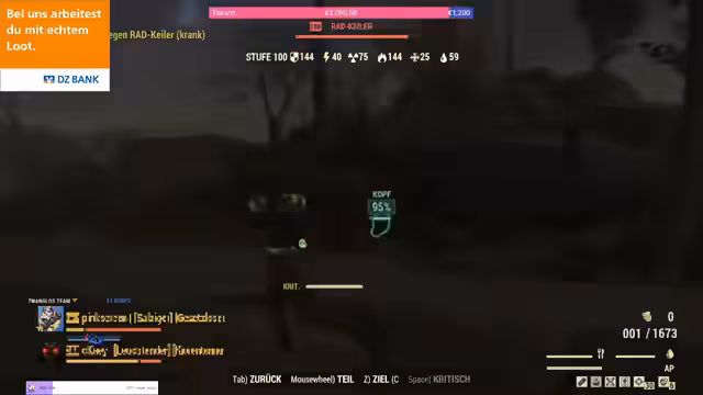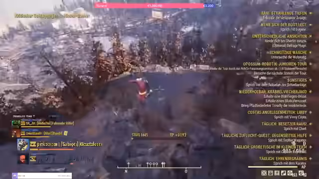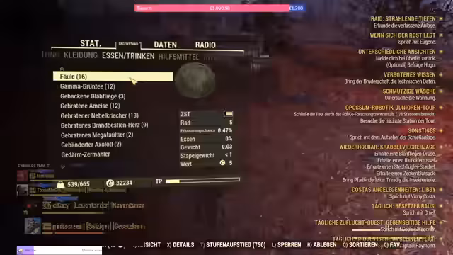 00:09:36Der Stream startet mit dem Gameplay von Fallout 76, wobei der Fokus auf den wöchentlich stattfindenden Events liegt. Der Streamer spielt den Dienstagabend, der im Spiel als Mittwoch um 18 Uhr stattfindet. Es geht um die neue Weekly-Challenge 'Wick wir mir', bei der es um das Sammeln von Insekten und 'verwerte Stahl' geht. Der Streamer zeigt seinen gebastelten Helm aus 'Hart aber herzlich' und erklärt die Notwendigkeit, bestimmte Ressourcen wie 'giftige Rußblumen' für die Herstellung von 'Psycho' zu sammeln.