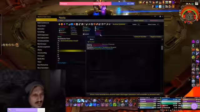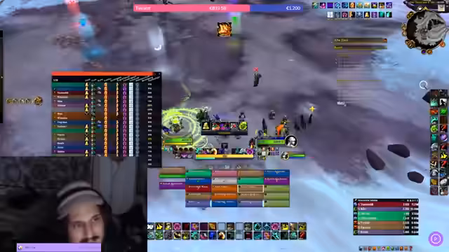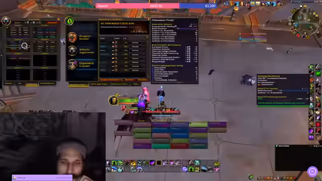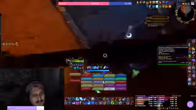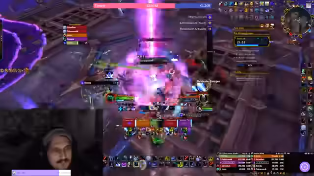 06:29:03Detaillierte Boss-Mechanics: Blattlast-Pull, Soak-Pflichten, Pusherbug, Wand-Vermeidung, und Def-CD-Timings. Der Streamer weist auf Probleme mit der Konzentration hin und fordert präzise Ausführung von Doppel-Soaks. Diskussion über Reset-Strategien und Positionierung (z. B. Ads hinter Pfützen). Bloodlust wird in der ersten Damage-Phase genutzt. Zusätzliche Addons wie MRT und Vigilance-Aura werden empfohlen. Es folgt die Vorbereitung auf die nächste Boss-Phase mit Spread- und Sammel-Mechanics.