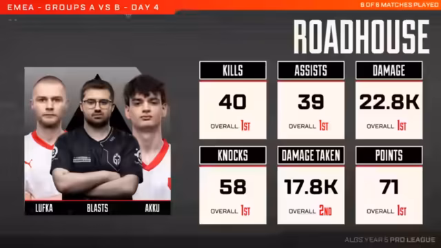 Nach sechs intensiven Spielen auf World's Edge und Stormpoint beendet Roadhouse den Tag als Sieger der EMEA Pro League. Mit einer dominanten Leistung und 61 Punkten übernimmt das Team die Spitze der Gesamtwertung. Alliance belegt mit dem zweiten Platz den Podiumsrang und macht sich damit für die Qualifikation zum Sapporo-Championat stark.