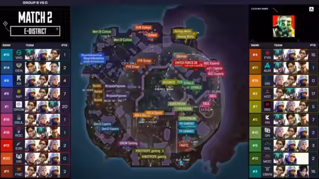 07:39:57The group stage concludes with match six, featuring a dramatic final circle in the E-Side area. Teams like Hotdog Mafia, GoNext, and Fnatic vie for position, with Fnatic making a pivotal push after reviving a player. The intense endgame sees multiple squads battling for survival, with GoNext ultimately securing the victory. Standings updates reveal Grow Gaming maintaining a lead, while GoNext and Fnatic surge in points. The section underscores the series' competitive balance and the teams' efforts to advance to the next stage.