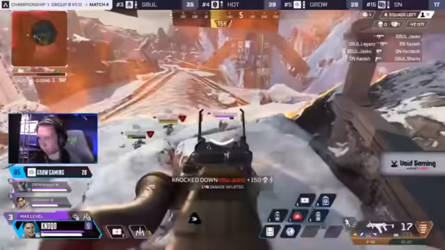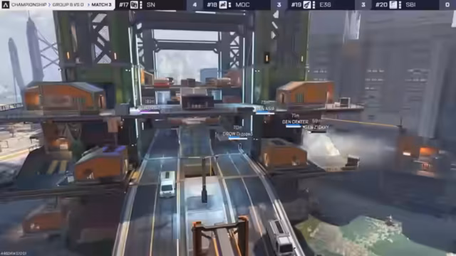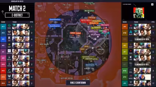 07:01:20Das vierte Spiel beginnt auf World's Edge mit einem Fokus auf die Nordseite der Map. Teams wie Gen.G, Shopify Rebellion und Ninjas in Pyjamas konzentrieren sich auf wichtige Loks wie Survey Camp und die Klimatisierung. Es beginnt ein intensiver Wettlauf um die besten Spawns und der erste Versuch, Early-Game-Kills zu sichern. Teams wie Men of Culture agieren als Duo und versuchen, einen Vorsprung zu erlangen, während andere wie Reignite bereits in Kämpfe verwickelt sind.