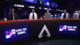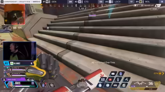 00:37:41Das Eröffnungsspiel der Gruppe A zwischen Fnatic, Crazy Thieves, Alliance und anderen Teams auf der Map Stormpoint beginnt mit einer hohen Legend-Pickrate von Newcastle und Caustic, was zu einem defensiven, wartenden Spielstil führt. Alliance kontrolliert den Nord-Sektor der Karte, während Crazy Thieves in eine schwierige Position geraten. Es kommt zu einem ersten großen Engagement, in dem Crazy Thieves von Shopify Rebellion und Alliance eliminiert werden, nachdem sie zwischen zwei Fronten eingekesselt wurden.