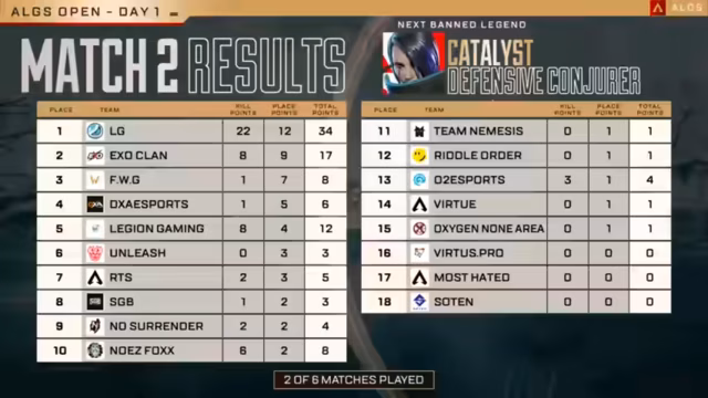 02:26:40In der Lobby zeigt sich ein knapper Kampf zwischen den Teams, wobei Vertus Pro mit 33 Punkten vor Legion Gaming mit 32 Punkten liegt. Nach einem spannenden Ende in Game 4 konnten NoizeFox den zweiten Platz belegen, was den Verlauf der Serie beeinflusst. Die Lage bleibt äußerst spannend, da die Teams in einem 3-Wege-Unentschieden stehen und die Entscheidung im Tie-Breaker fallen könnte. Dabei ist Krypto die erste Legende im Draft, Ash und Fuse könnten folgen. Die Meta entwickelt sich auf Broken Moon weiter, mit aggressiven Taktiken und klugen Positionierungen.