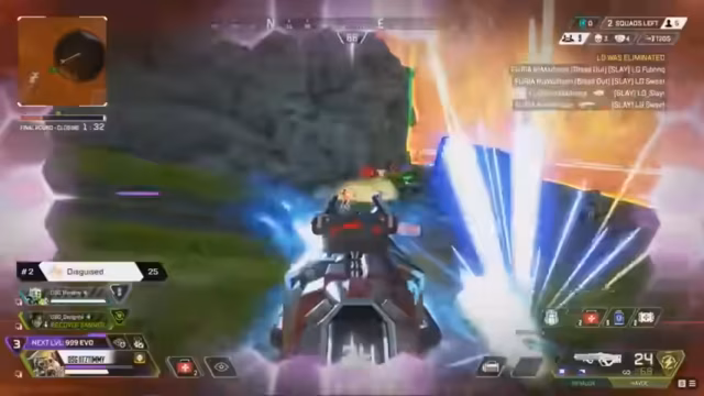 02:07:34FURIA wird aus dem laufenden Spiel eliminiert, während Disguise mit 40 Punkten den zweiten Platz belegt. Die Kommentatoren würdigen Moist Esports für ihren Sieg mit 11 Kill Points. Ein neues Spiel beginnt, in dem die Teams mit der neuen Map-Strategie auf Stormpoint ringen, insbesondere mit der dynamischen Anpassung an die Evo-Harvester und der daraus resultierenden Rotationen, die einen 'Blutbad' in der nächsten Zone erwarten lassen.