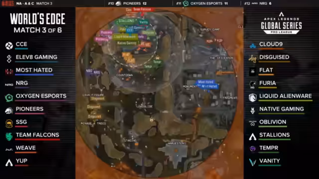 00:11:45Der Fokus liegt auf dem strategischen Point of Interest (POI) Drafting. Teams wählen Landeorte basierend auf ihrer Legenden-Komposition und der potenziellen Zone. Auf World's Edge fallen Nordzonen häufig, was Skyhook East für SSG zu einer strategisch klugen Wahl macht. Teams wie CCE nutzen Rampart und Loba für eine passive 'Cheese'-Strategie, während Furia aggressiv auf der Map agiert und den sehr unbeliebten POI Cliffside als Chance nutzt. Die Kommunikation von Furia während des Rotates zeigt deren Selbstvertrauen.