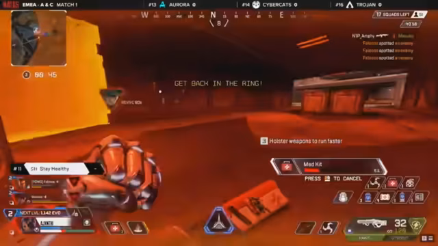 00:31:20Die ersten Minuten von Match 1 waren geprägt von intensiven Kämpfen und strategischen Rotationen. Aurora nutzte einen Lifeline-Pick als Ersatz, während FaZe Clan auf Bloodhound setzte. Teams kämpften um die Kontrolle zentraler POIs wie Barometer und Pylon. Währenddessen nutzte das Team Nada Finseer aggressive Taktiken, um Feinde auszuschalten und sich für den Endgame-Zirkel zu positionieren.