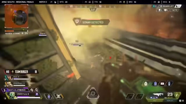 04:05:49Sechs Teams kämpfen um den Matchpoint, darunter Team Burger, das 49 Punkte hat und auf einen Sieg hofft oder darauf, dass die anderen Teams scheitern. Dreamfire ist auf den 17. Platz abgerutscht und riskiert, die Top 8 zu verpassen. Boogie Boarders sind ebenfalls gefährdet, trotz guter Platzierung in den Gesamtwertungen. Easy Flash von Legends Gaming wählt Raven's Blessing und Taste of Blood, was ihm als Fragger zugutekommt. Caustic erlebt ein Comeback und wird wieder häufiger gespielt, wobei viele Teams Particle Diffuser bevorzugen. Team Burg benötigt einen Sieg oder das Scheitern der anderen Matchpoint-Teams, um weiterzukommen. Legends Gaming sammelt Kills und Resets, während Team Burg Schwierigkeiten mit der Rotation hat. Legends Gaming, Wonton Dumpling und Tom Young-Kung sind Matchpoint-berechtigt, was die Verfolgung erschwert.