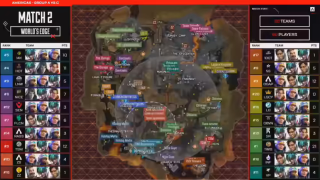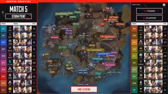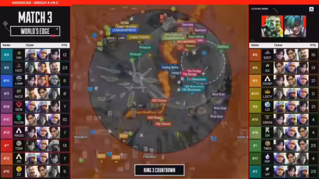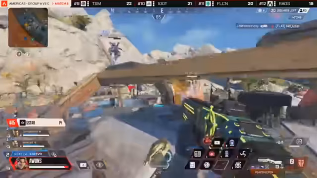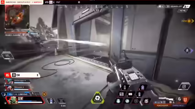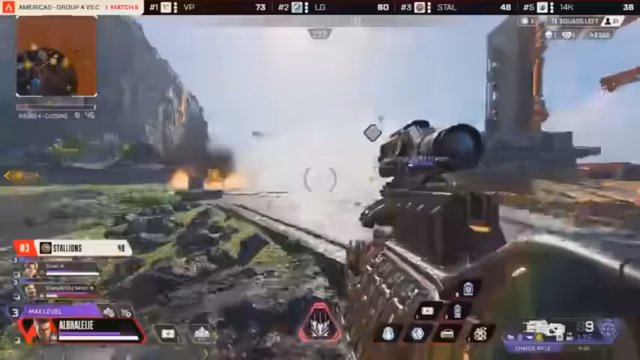 00:34:31Shopify Rebellion startet das Spiel mit nur zwei Spielern. Die Zone verschiebt sich nach Südwesten, was es für Teams im Norden schwierig macht, sich zu bewegen. Hot Dog Mafia und Skill Cakes befinden sich in einer guten Position. Virtus.pro kämpft und teilt sich auf. LG und Inferno werden eliminiert, wodurch die Anzahl der Teams auf 15 reduziert wird. Es gibt keine Survey Beacons in der Nähe, was die Informationsbeschaffung erschwert. TSM kämpft sich durch ZZ, die Gewinner von Matchday 1. Falcons greifen Stallions an, werden aber durch eine Charge Rifle verlangsamt. TSM versucht, die Situation auszunutzen, aber Falcons schaffen es, sich neu zu formieren. Falcons nutzen einen Evac, um in die Zone zu gelangen. Stallions halten ihre Position. TSM wird von Shopify Rebellion angegriffen. Leer Noe Winters wird eliminiert, wodurch noch acht Teams übrig sind. Falcons werden ebenfalls eliminiert. Hot Dog Mafia befindet sich in einer guten Position. Skittle Cakes auf Caustic bereitet Probleme. TSM gerät unter Druck und wird schließlich eliminiert.