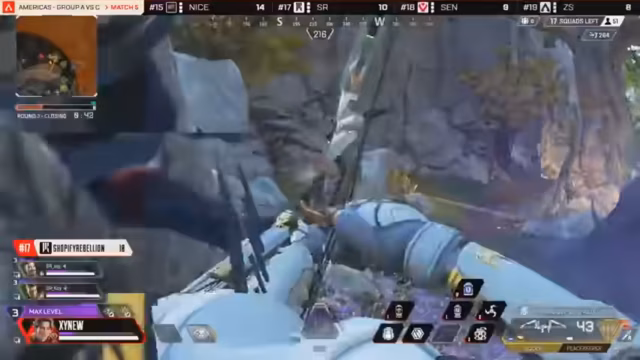 02:17:20Ein Team belebt Alverleli wieder, während Stallions eine Chance gegen 100 Thieves suchen. Phonny nutzt den Wraith-Portal für einen Rüstungstausch. Viele Teams auf Stormpoint finden keinen Weg. Newcastle-Spieler versuchen vergeblich, mit Felsen und Trennwänden Fake-Haven zu schaffen, aber der Schaden ist zu groß. Hot Dog Mafia kämpft an den Felsen, während Madness von Furia Schaden nimmt und Skittlecakes beim Versuch, ihn zu retten, zu Boden geht. Rambo setzt seine Ult ein. LG, mit Shubi, Naughty und Jelly, versucht es Madness schwer zu machen. Gibraltar erweist sich auf Stormpoint als nützlich, und LG setzt auf eine starke Verteidigung mit Rababar, Newcastle und Gibraltar. TSM nimmt ebenfalls an den defensiven Taktiken teil. Die Flexibilität von Catalyst und Ashe wird der defensiven Stärke von Newcastle gegenübergestellt. Gibraltar erlebt ein Comeback in der Meta, besonders in Verbindung mit der Peacekeeper.