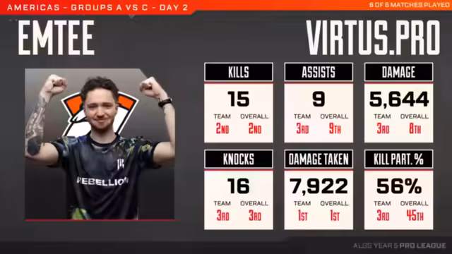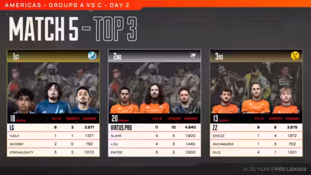 03:28:59Die Red Bulls haben sehr clearly gekickt in. Die Distanzwaffen wurden negiert, was die Rotationen für VP erleichterte. VP war kreativ und effektiv und das beste Team des Tages. Virtus.Pro nahm mehr Schaden, als sie austeilten, was zeigt, dass sie defensiv spielten. Es gab verschiedene Kompositionen, darunter zwei Gibraltars im finalen Kreis. Shopify Rebellion erhält etwas Action, aber MT nimmt mit seinem neuen Team Rache an seinen ehemaligen Teamkollegen. Gibraltar spielt eine wichtige Rolle. Es wird erwartet, dass Gibraltar häufiger eingesetzt wird, da er in einer Meta, die kleinste Fehler bestraft, für Stabilität sorgt. LG Stallions, 14k Resonance und DGAP werden ebenfalls erwähnt. ZZ zeigte eine starke Leistung und holte ihren ersten Matchday-Sieg mit 25 Punkten. Virtus.pro startet mit 25 Punkten gut. Es stellt sich die Frage, ob dieses Team in den Gesprächen über Amerika eine führende Rolle spielen sollte. Falcons hatte nicht den besten Tag. Virtus.Pro erzielte in den letzten drei Matches erste, zweite und erste Plätze. Die Konstanz von Virtus.Pro sollte beachtet werden. Falcons und andere Teams werden ihre Strategien und Kompositionen überdenken. Es wird erwartet, dass es viele Änderungen geben wird. Die Spieler müssen essen, schlafen und sich dann wieder auf das Schlachtfeld begeben. Nach diesen zwei Wochen gibt es noch genug Zeit, um Anpassungen vorzunehmen. VP führte die Rangliste an, aber Slayer führte die Kill-Rangliste an. Slayer zeigte mit 16 Kills in Nordamerika eine beeindruckende Leistung. Slayer ist ein Zeichen von einem Spieler, auf alle Cylindern. Slayer hat eine positive Einstellung und kann Kritik gut annehmen. Slayer spielte heute absolut verrückt und top fragged. Slayer ist einer der lustigsten Spieler in der ALGS. Wenn die Dinge so gut laufen, wird Slayer wahrscheinlich einen Platz in Japan haben. Die Veranstaltung findet vom 15. bis 18. Januar in Sapporo statt.
