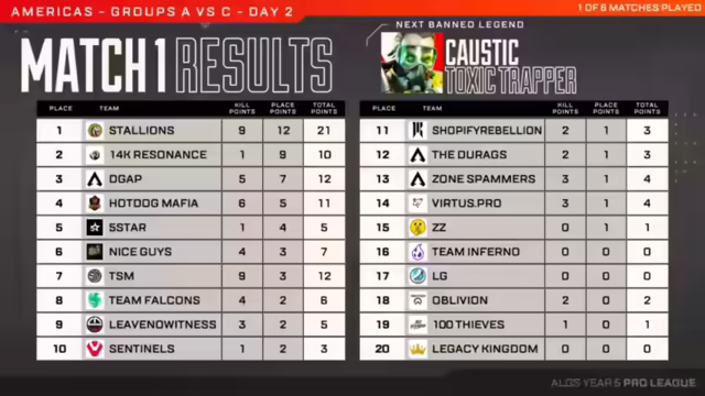 03:20:59VP liest die Zone fantastisch. Hotdog Mafia belebt Madness wieder. Sentinels versucht, Punkte zu sammeln. Legacy Kingdom versucht, zusätzliche Punkte zu sammeln. HotDogMafia schließt sich dem Kampf erneut an. Sentinels ist immer noch gefangen. Möller Loden greift in die Hottdok-Mafia ein. Sentinels bewegt sich mit dem Ring im Rücken. TSM belebt Panic wieder. Die späten Rotatoren haben Schwierigkeiten, auf dieser Karte Fuß zu fassen. Hotdog Mafia wird eliminiert, wodurch Sentinels Punkte sammeln kann. TSM scheint wie Fliegen zu fallen. Stalien ist in 3rd place, sie sind die einzige Team in der Final-Circle jetzt. Stallia hat keine Legenden, die irgendeine Art von Deckung bieten. LG ist nicht weit entfernt und könnte sie möglicherweise überwältigen. Die Smoke wird nicht genug sein. LG versucht, von dem Schaden zu profitieren, der bereits entstanden ist. Cody hält zwei verschiedene Teams auf. 14k ist das nächste Team Alive nach Virtuspro. Virtuspro hat 1 heute gewonnen. 14k hat vielleicht eine Chance, um sich in den Top 3 zu gewinnen. Shopify Rebellion ist ebenfalls noch am Leben und befindet sich in den Top 10. Zainu von Shopify-Rebellion sichert den zweiten Platz. Virtus Pro gewinnt Spiel 6 und die Gesamtwertung mit 89 Punkten. MT erzielt den Sieg gegen Shopify Rebellion, was den Sieg noch süßer macht.