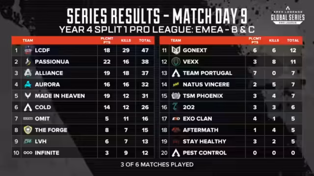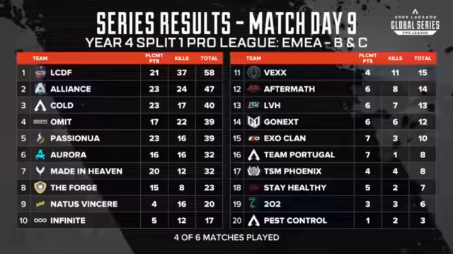 Am finalen Spieltag der ALGS-Saison entscheidet sich das Schicksal mehrerer Teams. Während Aurora bereits qualifiziert ist, kämpfen Teams wie LCDF und Navi um die begehrten Plätze im Gesamtklassement. Nach aufregenden Kämpfen, in denen sich Allianz und Omit durchsetzen, standen die Qualifikanten fest. Für Vexed war es die letzte Chance, sie sicherten sich den Verbleib in der Liga.