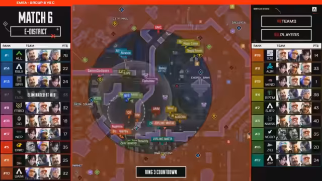 02:47:44Die Map E-District sieht eine Nordverschiebung des Rings vor, was Alliance in eine vorteilhafte Mittellage bringt und ihnen die Möglichkeit auf den ersten Platz des gesamten Matchdays eröffnet. Das Team nutzt diese Position, um von der Brücke aus in den Kampf einzugreifen und Schaden zu verursachen. Gleichzeitig wird die strategische Nutzung von Pathfinder-Ziplines als Schlüssel zur besseren Rotation durch die Map betont, da Recon-Legends wie Ash und Atera gebannt sind und alternative mobility benötigt wird.
