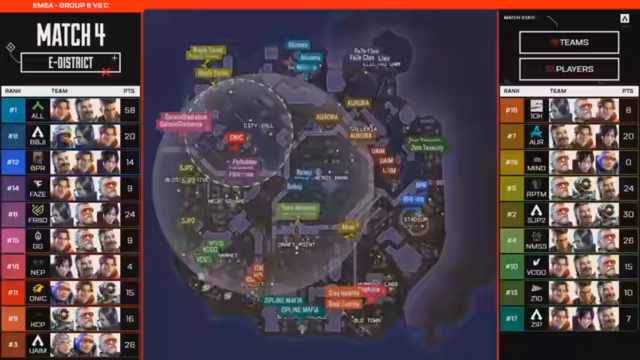 02:37:19Alliance dominiert die Tabelle mit einem großen Vorsprung, während der Kampf um den zweiten Platz zwischen SJP2 und anderen Teams wie VCGO tobt. Viele Teams kämpfen um die Plätze für die regionalen Finals. Für Match 5 werden erneut E-District gespielt und Ballistic oder Pathfinder als gebannte Legend erwartet. Der Fokus liegt darauf, ob Alliance weiter absetzen kann oder ob ein Team wie SJP2 einen überraschenden Sieg landen kann.