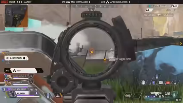 00:55:26Einige Teams bewegen sich sehr früh, darunter Alliance und Nessie, die schnell von Landslide aufsteigen. Go Next gerät in einen Kampf mit Nip, wobei FA Kids von Stacks heraufkommt, was die Situation für Go Next verschlimmert. Maske von Go Next wird niedergeschlagen, kann aber gerettet werden, was es dem Team ermöglicht, sich zu lösen. Aurora gerät ebenfalls früh unter Beschuss und muss sich aus einer schwierigen Lage befreien. Obwohl sie sich in einer guten Position befanden und die Zone wahrscheinlich auf sie zulaufen würde, ist ihre Zusammensetzung nicht ideal für das Campen. Sie müssen sich nun nach Norden kämpfen, was mit nur noch zwei lebenden Mitgliedern schwierig sein könnte. Sie versuchen, ein Banner zu craften und den Respawn zurückzuerlangen. Aurora befindet sich in einer schwierigen Lage, kann aber zumindest das Banner bergen und versucht, in Richtung eines Re-Spawn-Beacon zu gelangen. Hardeki wird wiederbelebt und kann sich in ein Gebäude retten, was für Aurora von großer Bedeutung ist, auch wenn er nur mit minimaler Ausrüstung zurückkehrt.