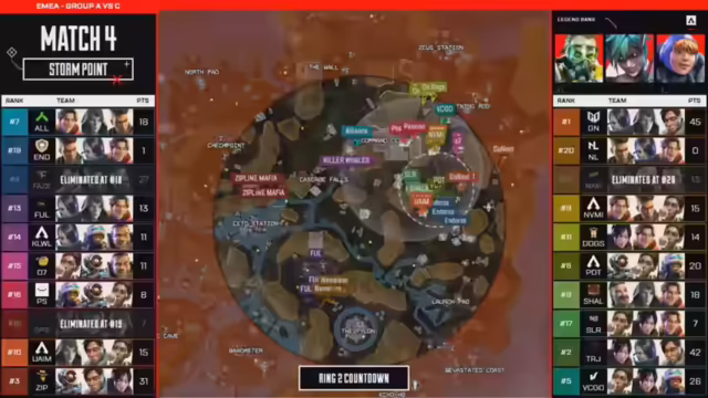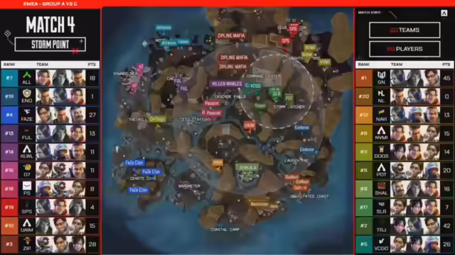 03:56:44Match 6 begann auf Storm Point mit der Verbannung von Rampart und der Einführung von Catalyst. MVMI landete bei Zeus Station und überraschte ein anderes Team. Hardecki von MVMI erkannte, dass die zahlenmäßige Überlegenheit gegen sie sprach. Shalala erlitt aus der Distanz Schaden. Nameless schaltete Light aus, aber GoNex's Versuch eines Third-Party-Angriffs scheiterte. Kinder gelang die Flucht, um einen Reset zu ermöglichen. Alliance geriet in einen Kampf mit mehreren Teams, wobei Unlucky von Alliance entscheidende Schüsse abgab. Zip-Line Mafia beobachtete die Situation. Alliance fügte Killer Whale genug Schaden zu, um sie auszuschalten. FaZe Clan versuchte, sich zu heilen, während Zane ausgeschaltet wurde. 07 setzte den Push fort, wurde aber von anderen Teams behindert.