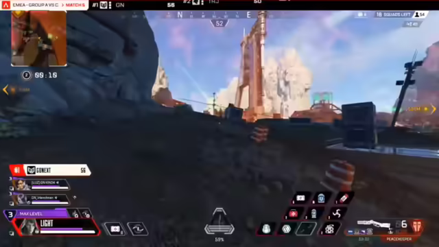 03:28:32Match 5 beginnt mit der erwarteten Rampart-Dominanz, nachdem Sparrow im vorherigen Match gesperrt wurde. Es wird erwartet, dass Catalyst in Match 6 eine größere Rolle spielen wird. Alliance gerät unter Druck von Killer Whales und muss sich stabilisieren. Einige Teams setzen auf ungewöhnliche Legendenkombinationen wie Mad Maggie, Vantage, Lifeline und Gibraltar. Alliance gewinnt den Kampf gegen Killer Whales und nimmt ihnen den Trident ab. FUL, die im vorherigen Spiel erfolgreich waren, müssen sich nun weiter nach Norden bewegen, um im Spiel zu bleiben. Viele Teams erkennen, dass nicht jeder Kampf es wert ist, geführt zu werden, und dass es manchmal besser ist, eine vorteilhaftere Position einzunehmen. Navi bewegt sich in Richtung Elrod, während Alliance nach dem Sieg über Killer Whales eine Zipline nutzt, um sich neu zu positionieren.