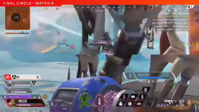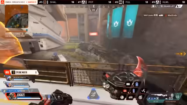 02:58:27FUL sichert sich einen Mythic Bin, was ihnen einen Vorteil im späteren Spielverlauf verschafft. Kashera und Natsky geraten in Schwierigkeiten, werden aber von 07 unterstützt. KSW versucht, Druck auszuüben, ohne sich zu sehr zu exponieren. ZipLine Mafia ist weiterhin aktiv und versucht, ihre Position zu verbessern. Alliance muss in die Zone gelangen und steht vor der Entscheidung, ob sie ein Gebäude stürmen oder im offenen Gelände kämpfen sollen. Alliance und Effect zeigen ihr Können mit dem PK und Stinger Bolts. Alliance eliminiert Zipline Mafia und rächt sich für das letzte Spiel. Alliance zeigt Disziplin in diesem Engagement und wartet auf den richtigen Moment, um anzugreifen. GoNext sichert sich eines der besten Gebäude im finalen Kreis und K. Swinney erwischt Hockies mit dem Kraber. Shalala muss einen Weg finden, aus ihrem Gebäude in den finalen Kreis zu gelangen.