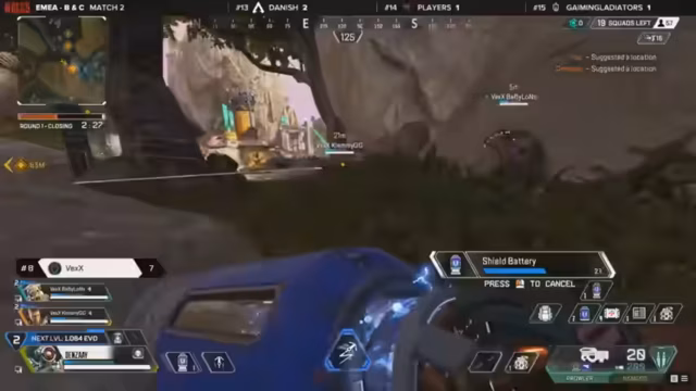 01:32:15Exoclan setzt auf Pathfinder, dessen Pickrate bei 20% liegt, was Rotationen erleichtert, besonders in Stormpoint. Teams nutzen die Zip-Line für Höhenunterschiede und Rotationen. Alliance hält die Nordseite, während DMS über ihre nächsten Schritte entscheidet. GG und Blast gewinnen Kämpfe, aber ihre Überlebensfähigkeit wird in Frage gestellt. ExoClan ist sich der umliegenden Teams bewusst und muss ein zu spätes Eingreifen vermeiden. Dark Veil könnte helfen, aber Exo-Clan wird es schwer haben, in der Zone zu überleben. Stay Healthy wird eliminiert, während chaotische Kämpfe im Nordosten stattfinden. Rats ist als einziges Team sicher in der Zone, aber es handelt sich um einen Solo-Spieler. Players und Danish kämpfen, während ANC Outplayed und Black Mist International isolierte Gefechte führen. Nine Lies könnte unbemerkt in die Zone gelangen, aber fast alle befinden sich außerhalb des Kreises.