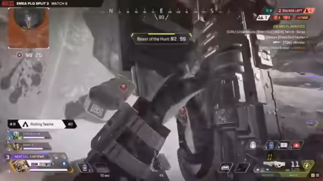 02:41:18Die Apex Warlords kämpfen sich in einem 2v1-Szenario durch das Endgame mit nur 45 Sekunden Restzeit. Das Team zeigt beeindruckende Leistung mit Initial Damage und Knock, während andere Teams wie Zeri versuchen, ihre Position zu halten. Die Rolling Teams nutzen die Gelegenheit, um wichtige Punkte zu sammeln und sich im Leaderboard nach vorne zu arbeiten. Die Zone hat sich zu den Teams positioniert, was die Dynamik verändert und Chancen für späte Entscheidungen eröffnet.