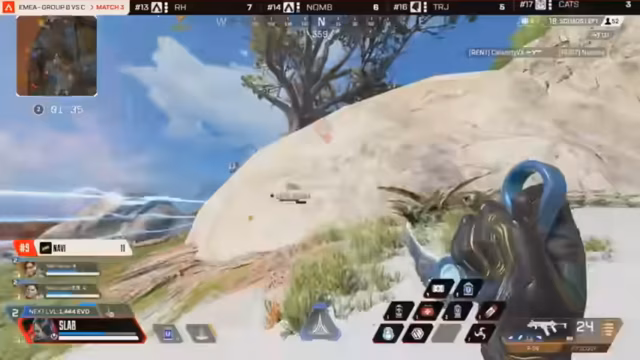 00:30:36Der Countdown zum ersten Spiel der Gruppen B gegen C beginnt. Auf Storm Point wird beobachtet, dass Caustic mit 95% die meistgespielte Legende ist. Viele Teams nutzen die Tridenkombination aus Gibraltar, Newcastle und Rampart zur defensiven Absicherung. Die ersten Kämpfe finden im Bereich Stormcatcher statt, wobei Teams wie Zuni und Navi bereits in der frühen Phase eliminiert werden.