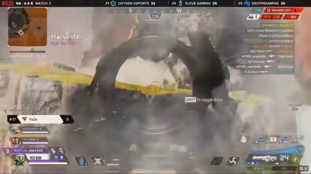 02:19:23Nachdem Dark Zero das vierte Spiel gewonnen hat, startet FaZe im fünften Match mit einem Nachteil. Sie sind die einzige Squad, die sich nicht im Ring befindet, und nutzen eine Evakuationstür, um sich umzuschauen und Evo-Harvester zu farmen. Obwohl sie versuchen, strategisch weiterzurotieren, werden sie von Oblivion angegriffen und es kommt zu einem heftigen Kampf. Trotzdem schafft es FaZe nicht, die Niederlage abzuwenden und wird ausgeschieden, was ihre schwierige Position in der Rangliste weiter zementiert.