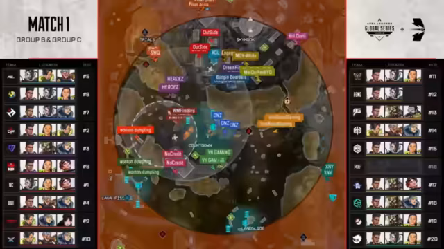 00:34:15Der erste Spieltag beginnt auf der Map Stormpoint in der Lobby für Gruppen B und C. Das Spiel startet an Lava Siphon, wo die Teams Killdevil und NoCredit aufeinandertreffen. NoCredit nutzt die Map-Funktion der Ring Console mit Catalyst, gewinnt den early Fight mit einem Knockout und sichert sich so den Vorteil für die Ring-Informationen.