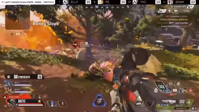 03:26:50Match Nummer vier auf Stormpoint beginnt mit intensiven taktischen Manövern. Die Teams Eternal und Cybercats agieren aggressiv, während FaZe strategische Vorteile sucht. Ein Schlüsselmoment ist die Revive-Beacon-Aktion von Nono, der trotz seinem Tod ein Mobiles Respawn-Banner auf der Hochplatzierte, was später entscheidend für FaZe wird. Synetic zeigt dabei starke Leistungen und dominiert durch hohen Schaden und kluges Positionsspiel, was seine Teamstrategie unterstreicht.
