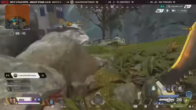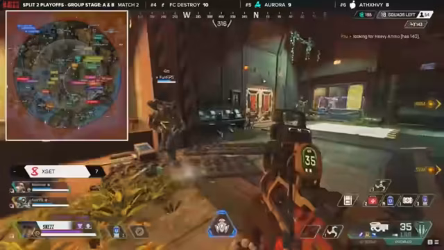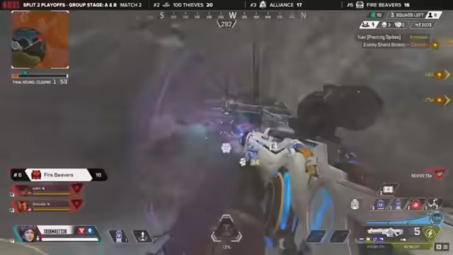 11:58:56Ein intensiver Kampf entbrennt, als Verhulsen verspricht, einen angeschlagenen Gegner auszuschalten, während Rez noch am Leben ist und versucht, sich zu retten. Gleichzeitig formieren sich vier gesunde Squads für das Endgame, darunter Complexity, Vex Gaming, Metathe und SEF. Complexity positioniert sich strategisch in einem Gebäude und muss einen Angriff von NRG abwehren, während die Ringzone schrumpft und die Teams gezwungen sind, zu kämpfen. Die Nutzung von Legend-Fähigkeiten wie Gibbys Bubble und Caustics Fässern wird entscheidend sein, um den Schaden zu minimieren und die Kontrolle zu behalten.