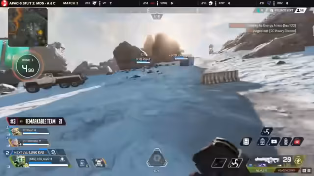 04:52:59Im zweiten Spiel nutzen Teams wie Remarkable ihre Valkyrie-Pick für schnellere Rotationen. Great Fanta erobert die Kontrolle über Syphon, während sich andere Teams wie Legends Gaming vorsichtig positionieren. Die Ringverlagerung zwingt die Teams zur taktischen Neuausrichtung, wobei einige Teams wie Evo's Predator ihre Positionen clever nutzen.
