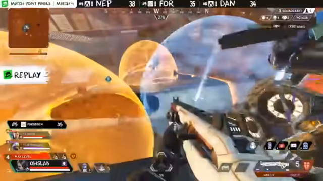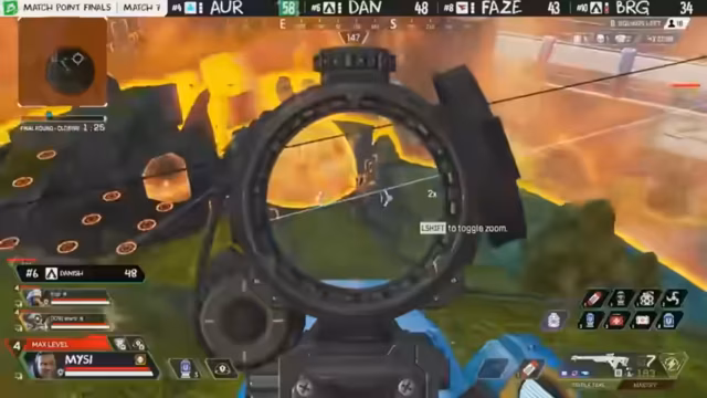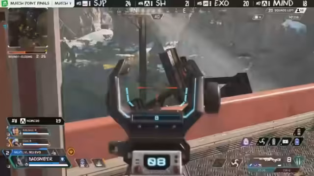 03:47:51Es verbleiben zehn Teams, von denen drei Matchpoint erreicht haben. Aurora befindet sich in einer vorteilhaften Position im Untergrund unter der Brücke. Nephilim dominiert den nördlichen Bereich und hat eine gute Chance auf den Sieg, besonders wenn sie Mind eliminieren können. Night Squad wurde bereits ausgeschaltet. Nifflung auf der High Ground ist eine strategisch wertvolle Position, insbesondere gegen N.I.P. Viele andere Teams sind im Low Ground und müssen sich durch Zip-Lines und Gibi-Bubbles bewegen. Neff wird ausgeschaltet, wodurch nur noch Aurora auf Matchpoint verbleibt. Danish könnte Aurora gefährlich werden, aber Kazak von Aurora rettet das Team mit einem Mobile Respawn Beacon. Danish ist ebenfalls auf Matchpoint, was ihre Prioritäten beeinflusst. Aurora erhält einen Reset, was ihre Gewinnchancen erhöht.