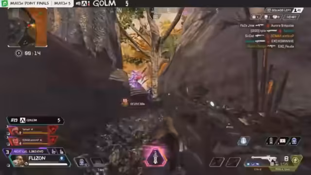 02:14:33Alliance benötigt noch drei Punkte und hat Kills in Reichweite. Sie nutzen eine goldene Gelegenheit, um KP zu sammeln und sich dem Matchpoint zu nähern. Alliance erreicht die Top 5, während andere Teams außerhalb der Zone kämpfen müssen. Unlucky wird ausgeschaltet, und Effect scheidet ebenfalls aus. Aurora ist das einzige Team, das noch die Chance hat, den Matchpoint zu erreichen. Nephilim hat ebenfalls eine Chance, benötigt aber Kills. Das Finale ist ein 3v3v3, wobei jedes Team in einem Drittel der Zone positioniert ist. Forbidden hat den High Ground und eine Kraber. Danish greift Nephilim an, aber Bubbles verhindern den Erfolg. Forbidden wartet ab und nutzt seine Ressourcen. Aurora scheidet auf Platz 12 aus, hat aber sieben Kills erzielt. NIP hat einen Punkt erzielt. Aurora, Alliance und Tantigl sind sehr nahe am Matchpoint. Forbidden gewinnt das Spiel mit den meisten Punkten, aber Aurora ist das einzige Team auf dem Matchpoint.