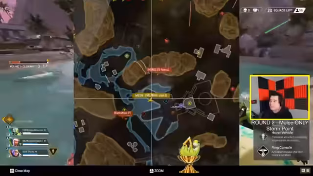 01:00:11Der 'Melee Only'-Modus auf Storm Point entwickelt sich zu einem hektischen und chaotischen Kampfgeschehen. Die Nutzung des Tridents ermöglicht ein schnelles Vorankommen auf der Map und führt zu ständig wechselnden Frontlinien. Ein zentrales strategisches Element ist das kontrollierte Zerstören der 'Gentien', um Gegner mit Caustic-Gas einzusperren. Kämpfe finden oft um diese Geräte statt, da sie eine mächtige taktische Waffe darstellen. Trotz der anfänglichen Nahkampf-Regel nutzt das Crypto-Team seine Drohne weiterhin für strategische Vorteile.