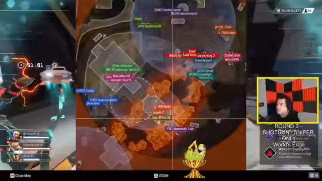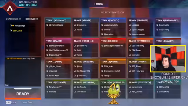 01:36:52Aufgrund von technischen Schwierigkeiten mit dem geplanten '3-Strikes'-Modus wurde das Regelwerk kurzfristig angepasst. Der dritte und vierte Lastrunde werden stattdessen im 'Shotgun und Sniper'-Modus auf der Karte World's Edge ausgetragen. Ein Team wird ausgeschlossen, da der Legend Rampart nicht für diesen Modus verwendet werden kann. Dies erfordert eine Anpassung der Strategien der Teams, da sie auf bestimmte Waffenklassen beschränkt sind.