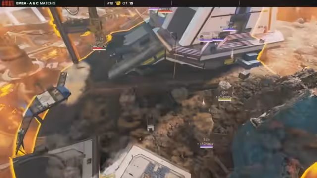 01:00:21Im Mittelspiel etablieren sich klare Machtbereiche auf der Karte. 40% W sitzt auf wertvoller Ausrüstung, während Made in Heaven nach einem Revival aggressiv agiert und andere Teams am Checkpoint unter Druck setzt. Element 6 kontrolliert mittels Slabs Bloodhound-Ultimative die Schlüsselpositionen und eliminiert mehrere Gegner. LCDF kämpft sich zum Checkpoint hoch, während Forge eine bittere Niederlage gegen Red Dragon erleidet und früh aus dem Match ausscheidet. Die Dynamik der Teams zeigt sich in den taktischen Entscheidungen, ob man aggressiv kämpft oder strategisch ratiert.