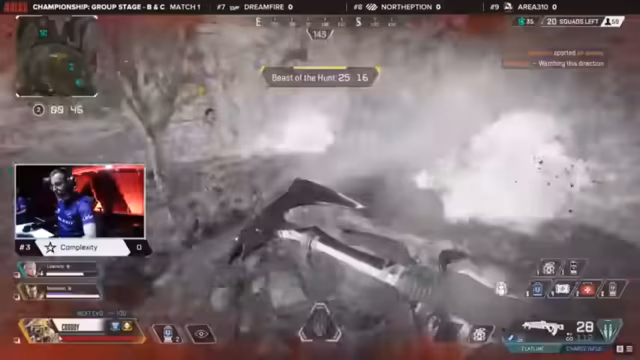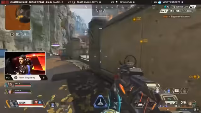 07:39:01Start a Fight verstärkt die Türen und versucht, Riddle Order auszusperren. Die meiste Action wird sich in Geyser abspielen, sobald das nächste Circle bekannt ist. Das nächste Circle wird voraussichtlich in der Nähe der Bühne enden, wobei Black Hand derzeit eine gute Position hat. Black Hand hat eine vorteilhafte Position, da der Weg dorthin über ein niedriges Gelände führt. Moist wird zwischen Start a Fight und 100 Thieves eingeklemmt. 100 Thieves profitiert von der Aufgabe der Position durch Moist und sichert sich einen Vorteil. Black Hand befindet sich in einer sehr guten Position, da das nächste Circle zu 100% auf sie ausgerichtet ist. Onik wird von Dreamfire und Eggset eingeklemmt. Team Singularity bewegt sich vom Chokepoint von Geyser zur Nordseite in Richtung Black Hand. Da Gibraltar in der Meta nicht mehr so präsent ist, ist es schwieriger, unter und über den Gebäuden zu spielen. Anic eSports und FC Destroy werden eliminiert. E6 befindet sich auf dem Dach und nutzt die Beast of the Hunt von Slayer's Infinity.