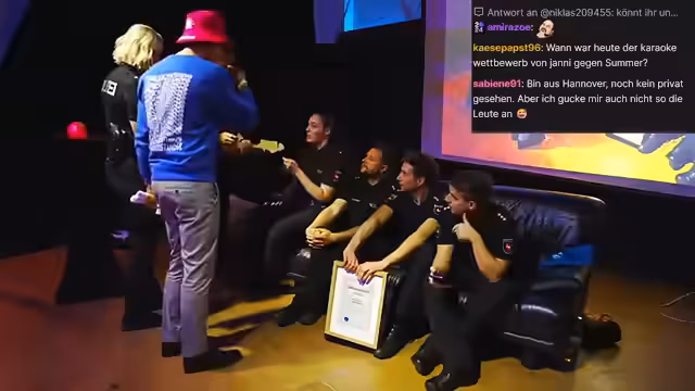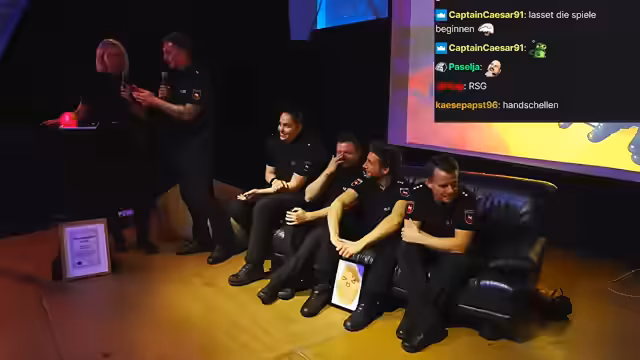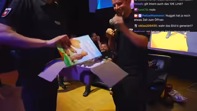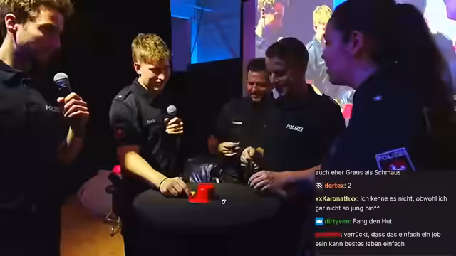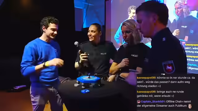 00:51:08Kurz vor Ende tritt ein technisches Problem auf: Die Kamera fällt wegen einer Powerbank aus, wird aber durch eine feste Stromversorgung stabilisiert. Es folgen kurze Rückblicke auf die erste Twitch-Präsenz einer deutschen Behörde und die Hoffnung, dass andere nachziehen. Der Stream endet mit einem Gruppenfoto, Jubelrufen und der Zusage, die Auszeichnung in den Räumen der Polizei Hannover zu präsentieren.