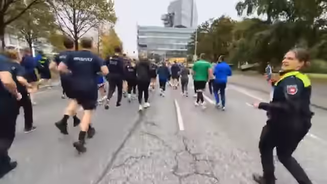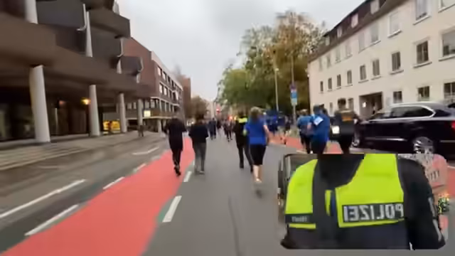 01:14:01Nachdem Baumi eintrifft, laufen die Teilnehmer gemeinsam weiter. Sie sprechen mit einem Feuerwehrmann, der in kompletter Montur läuft und die Wärme unterschätzt hat. Es wird betont, dass der Lauf für Respekt und gegen Gewalt an Einsatzkräften ist, mit Beteiligung von Feuerwehr, Johannitern und anderen Gruppen. Die Strecke führt durch Hannover, und die Gruppe erreicht nach etwa vier Kilometern das Ziel. Anschließend wird der Weg zurück zum Polizeistand angetreten.