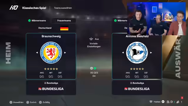 02:08:29Der Stream beginnt mit technischen Vorbereitungen für ein FIFA-Spiel, wobei Lautstärke und Kopfhörer angepasst werden. Die Moderatoren planen ein interaktives Spiel mit der Community, bei dem Zuschauer via Vorhersage über den Ausgebnis abstimmen können. Die Entscheidung fällt auf den 95er Modus, um ein ausgeglichenes Spiel zu gewährleisten. Dabei wird ein Wettkampf zwischen "Lieblingsbundesland" und "Lieblingsstadtstaat" inszeniert, um die Spannung zu erhöhen und die Community aktiv einzubinden.