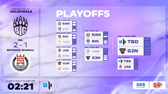 Eintracht Spandau scheitert im prestigeträchtigen Derby am Team Big. Trotz eines hochspannenden und ausgeglichenen Spiels konnte sich Big am Ende durchsetzen. Das Finale der Wintersplit ist damit erreicht.