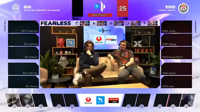 01:57:37Die Kommentatoren analysieren das zweite Spiel und loben Big für sein kontrolliertes und entschiedenes Vorgehen, insbesondere im Umgang mit Objectives und Teamfights. Sie führen den Sieg auf die bessere Objiv-Control und die Nutzung von Small Wins zurück. Anschließend wird der Draft für das dritte Spiel analysiert. Beide Teams zeigen sich abwechslungsreich, doch die Bannstrategie gegen Power of Evil und Orianna steht im Fokus, was darauf hindeutet, dass beide Teams den Draft gegenseitig schwächen wollen, bevor in das nächste Spiel gestartet wird.
