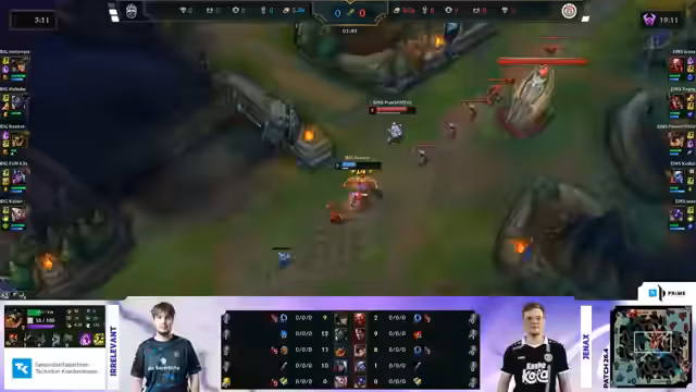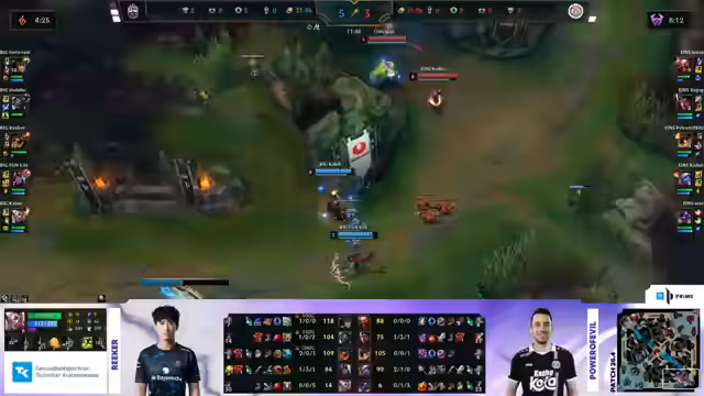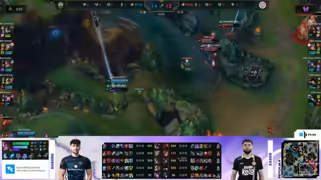 03:23:25Das Spiel dreht sich um einen ständigen Kampf um Map-Kontrolle und Ressourcen. Big führt nach mehreren 2v2- und 3v3-Kämpfen mit einem Goldvorsprung von 2000 Gold, nachdem Kaiser erneut einen Kill auf Seas holen konnte. Spandau versucht mit der starken Scaling-Tristana von Kidui und der ebenfalls dominanten Cassiopeia von Jenex ins Spiel zurückzukommen. Big sichert sich die ersten beiden Drakes, während die Top-Lane für Spandau ein Riesenproblem darstellt, da Xar'gok stark im Rückstand ist und seine Rolle nicht erfüllen kann.