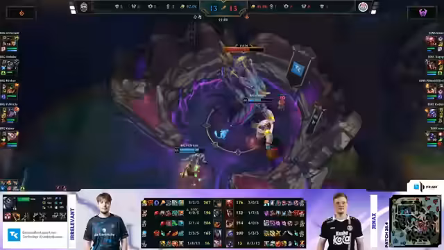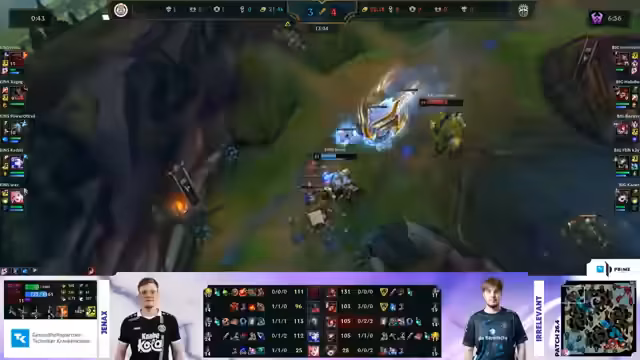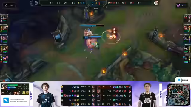 00:46:59Big erobert nach einer erfolgreichen Teamfight-Situation den zweiten Drake und dreht damit das Spiel zu seinen Gunsten. Der Goldvorsprung von Big wächst auf über 1.000 Gold an, was den Druck auf Spandau erhöht. Insbesondere die Top-Lane wird zum Austragungsort eines Duells, in dem sich Jenex von Spandau und Irrelevant von Big gegenseitige Solo-Kills liefern. Das Spiel bleibt jedoch offen, da Spandau trotz des Nachteils auf einige Kill-Sprengkraft in den Teamfights zurückgreifen kann und seine Objective Control weiter ausbaut.