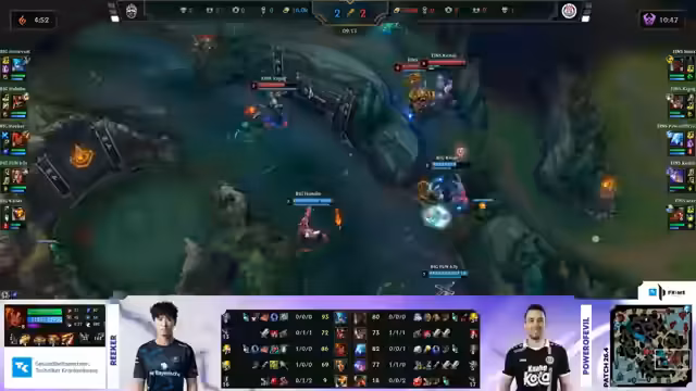 00:54:11Das Spiel beginnt mit einer aggressiven Jungle-Phase. Xargot, der Jungle von Big, wird tot im Enemy-Camp gesichtet, was sofort kritisiert wird. Die Analyse der Picks steht im Mittelpunkt: Kaisers Niko als Support gilt als anspruchsvoll, besonders wegen des tricky Mid-to-Late-Game, was aber bisher gut funktioniert. Parallel dazu wird Power of Evils Ari als stärkste Bedrohung identifiziert, mit einer beeindruckenden KDA, die ihn zum dominanten Spieler auf der Map macht.
