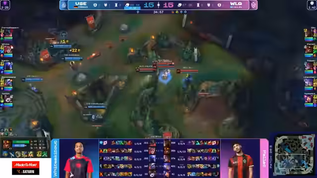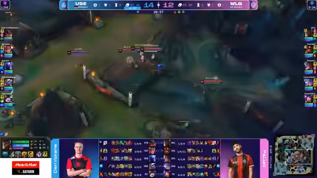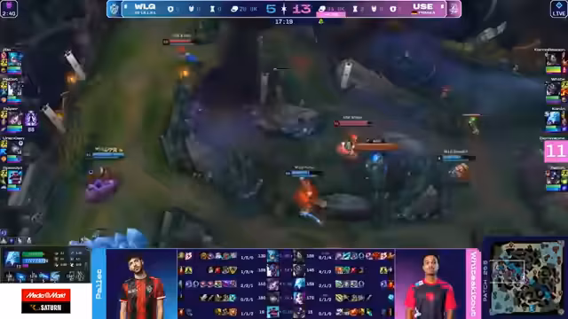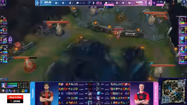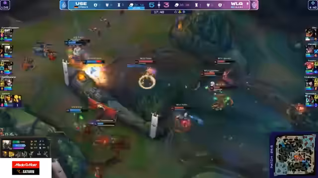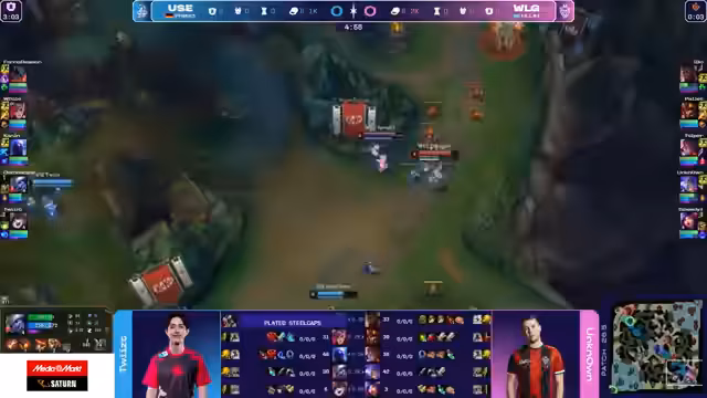 02:38:52Das Early-Game verläuft für WLG katastrophal. For no Reason verliert Top-Lane seine Rolle gegen Akali und gibt dabei wichtige Todesfälle ab. Gleichzeitig verliert auch die Bot-Lane. Analysten sehen das Problem in der fehlenden Map-Kontrolle und der passiven Spielweise von WLG, die es UOL leicht macht, aggressiv zu spielen. UOL agiert proaktiv und zwingt WLG in eine defensive Position.