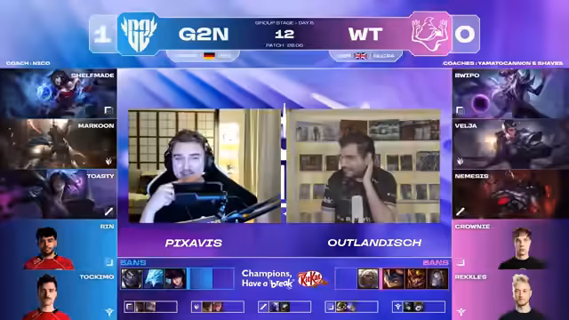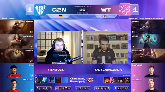 04:03:38G2 North gewinnt das erste Spiel überzeugend nach einem beeindruckenden Comeback von einem 2000-Gold-Defizit zu einem 6000-Gold-Lead. Das Sieg wird der überlegenen Teamfight-Koordination und dem Makro-Spiel von G2 zugeschrieben, während Witchcraft als neues Team noch nicht eingespielt wirkt und Tilt-Errors zeigt. Im zweiten Spiel analysieren die Kommentatoren den Draft. G2 setzt auf klare Engage-Konzepte mit Picks wie Pantheon und Sion, während Witchcraft auf Front-to-Back reagieren muss. Die Kommentatoren sehen G2 im Vorteil, da sie als Einheit agieren und der Draft für sie vielversprechend ist.