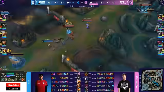04:39:30Ein Teamfight eskaliert zu einer 1-gegen-5-Situation für Shavemate von Witchcraft. Trotz der scheinbaren Unterlegenheit gelingt es Shavemate, drei G2-Spieler zu eliminieren und das Spiel für sein Team zu halten. Die Experten sind beeindruckt von seiner Leistung, erkennen aber auch die Fehler in G2s Koordination. Witchcraft nutzt diesen Moment, um selbst einen Baron Nashor zu starten und den Goldvorteil zu wenden.
