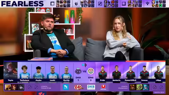 01:10:15Spandau nutzt die entstandene Stärke bei einem Teamfight um den Draken und eliminiert mehrere Gegner. Obwohl Taito für DKB einen kleinen Vorsprung hält, ist das Spiel für DKB entschieden. Das starke Teamfighting und die skaliende Power von Spandau führen zum 1:0. Das Duo blickt auf die nächsten Spiele und darauf, wie DKB darauf reagieren wird.