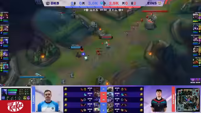 03:39:43Die Midlane wird zum Ort des ersten entscheidenden Teamfights. DKB versucht, Asuka zu ganken, aber er kann sich mit seiner Ultimate retten. Kurz darauf startet Eintracht Spandau einen Gegenangriff, bei dem Power of Evil mit einer perfekt platzierten Morgana-Ultimate den gegnerischen Zettert für drei Sekunden festhält und so einen Kill ermöglicht. Dabei wird Loki von Power of Evil getötet, was zeigt, wie wichtig es für DKB ist, den Hauptcarry des Gegners zu eliminieren.